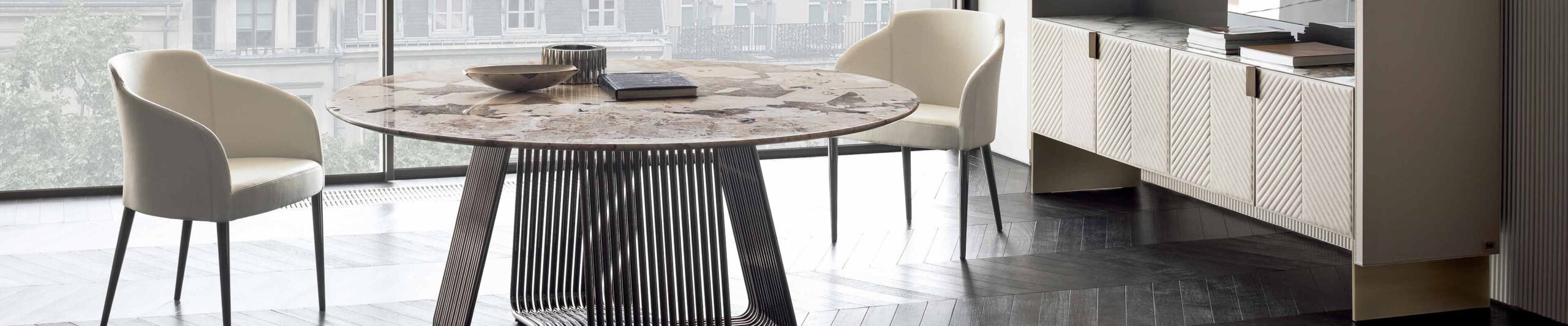 Nella Vetrina’s Italian dining chairs are conceived in collaboration with leading European designers—crafted as statement pieces for the dining environment. The collection includes luxurious chairs, armchairs, and matching side chairs, each made in Italy and shaped through a deep understanding of proportion, form, and material detailing. Select from a curated range of modern Italian designs, expertly crafted in wood, steel, and other exclusive materials chosen for their integrity and aesthetic refinement. From sculpted wood to formed steel and exclusive surface treatments, each design reflects a modern interpretation of Italian craftsmanship. Upholstery options include a curated selection of fabrics and leathers, allowing each piece to be tailored to your space. To create a bespoke Italian dining room chair, please inquire with our design team.