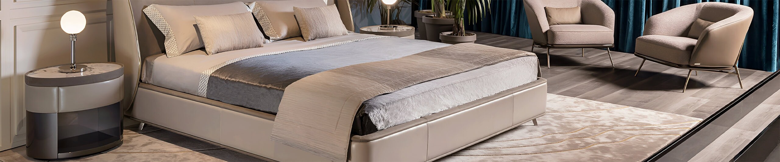Our luxury Italian storage beds integrate innovation and technology. Elegant yet practical, our custom made designs feature internal storage with a sophisticated hydraulic gas lift and an integrated hidden handle. The mechanism is engineered for smooth, effortless access—bringing functional ease without compromising the integrity of the design. Upholstery options in fine fabrics and Italian leathers are available to choose from, offering material continuity across the broader bedroom composition. Storage is discreet, and seamlessly embedded within the frame. For tailored solutions and material coordination, our design team is available to assist.