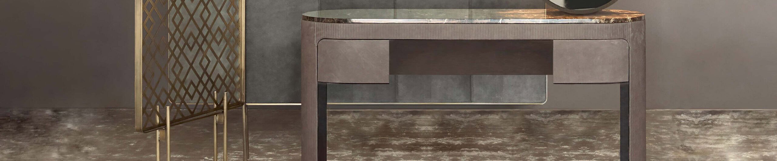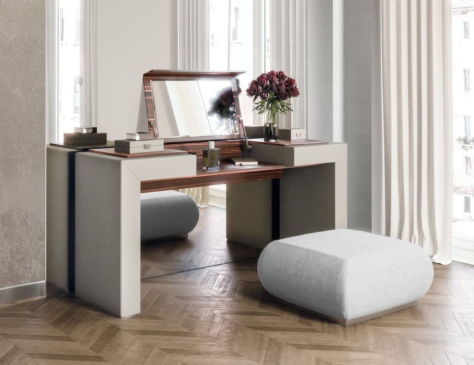 Our luxury designer Italian vanity tables feature collections by leading Italian and international designers. All our makeup vanity tables, dressing tables, and makeup desks can be customized and personalized into one-of-a-kind designs that belong exclusively to you. Our designs are conceived as both functional objects and refined bedroom statements. Features include integrated flip-up mirrors with led lighting and concealed storage. For bespoke makeup vanity solutions and material selections, our design team is available to guide each stage of the process.